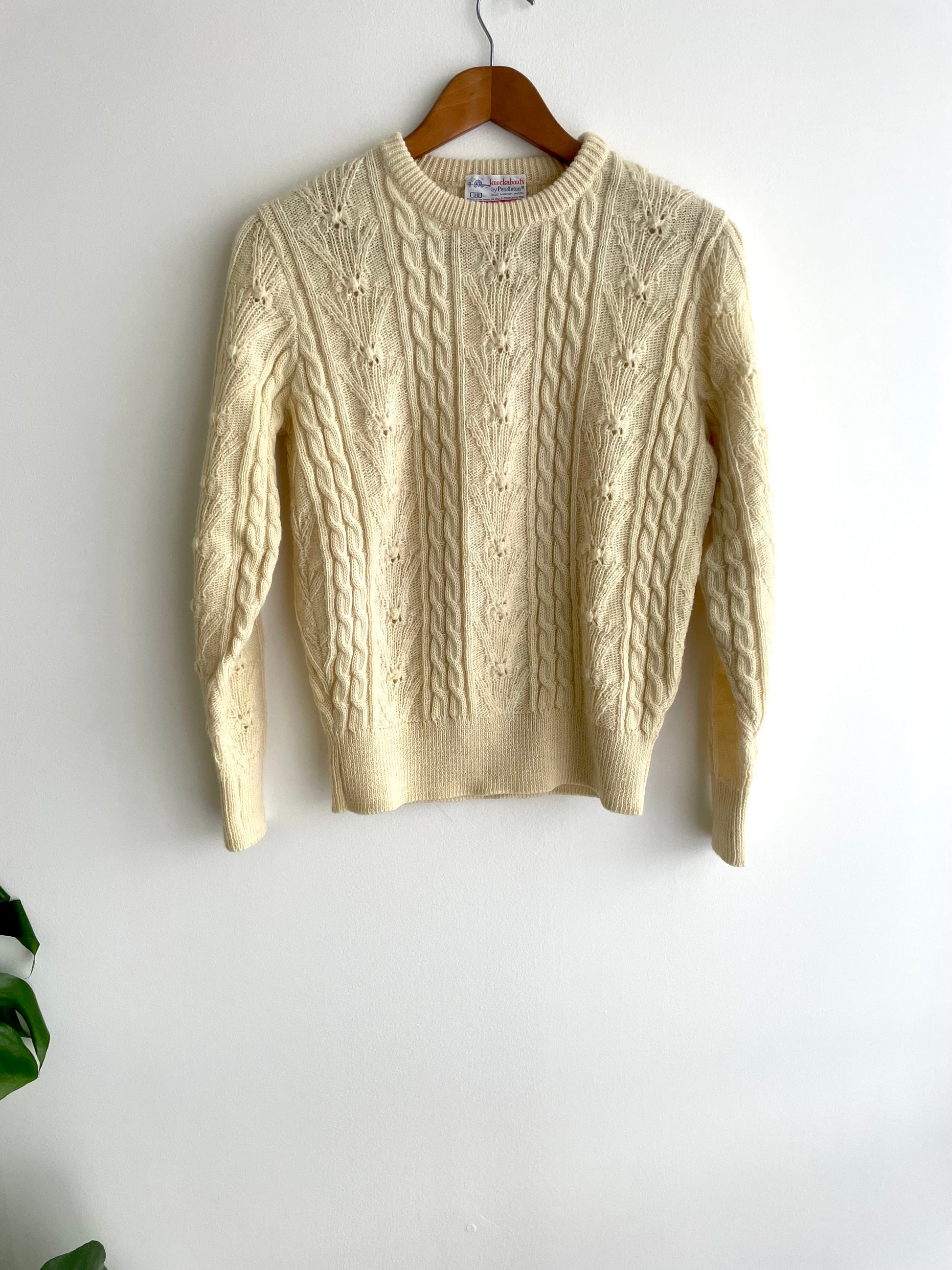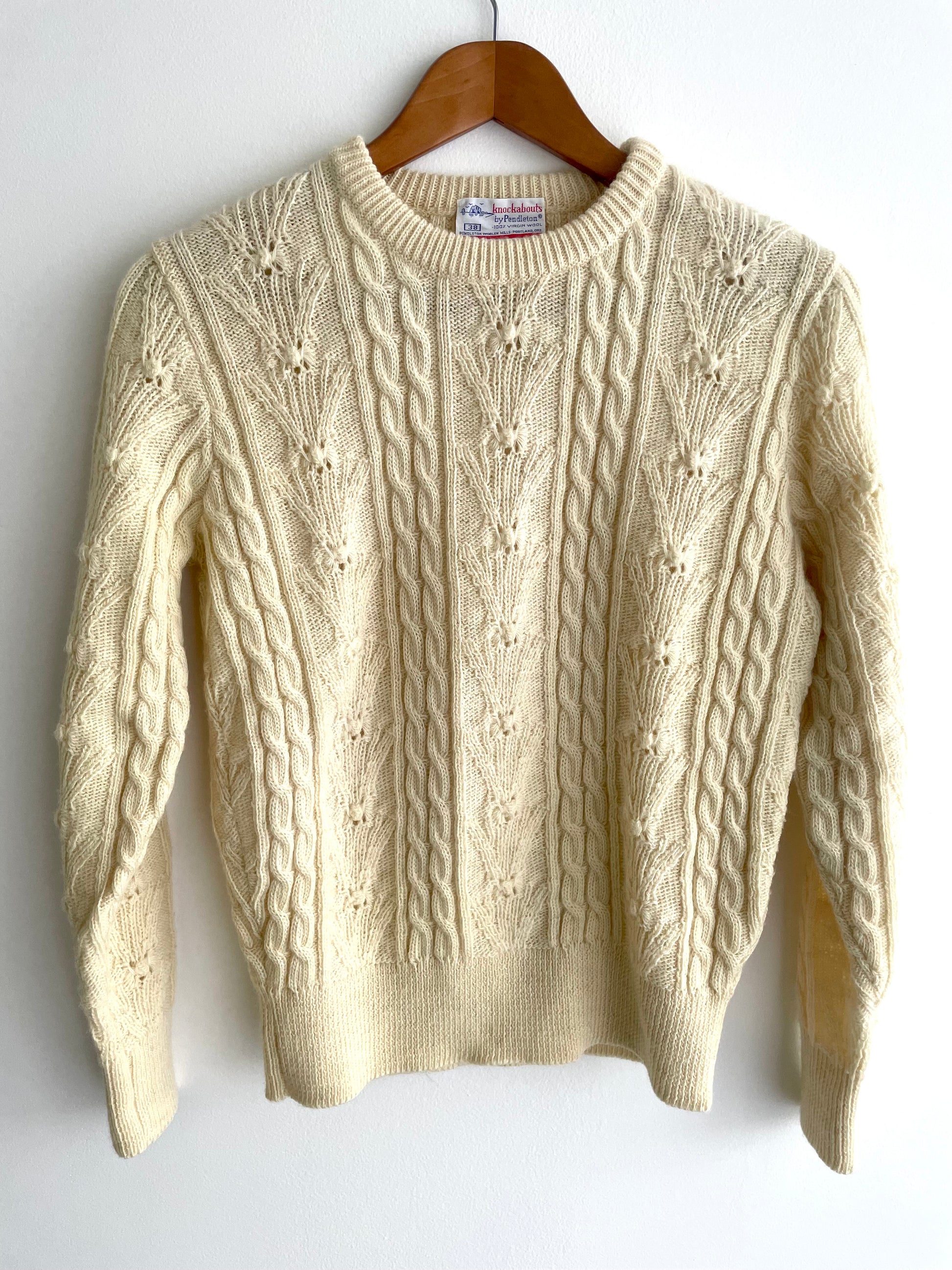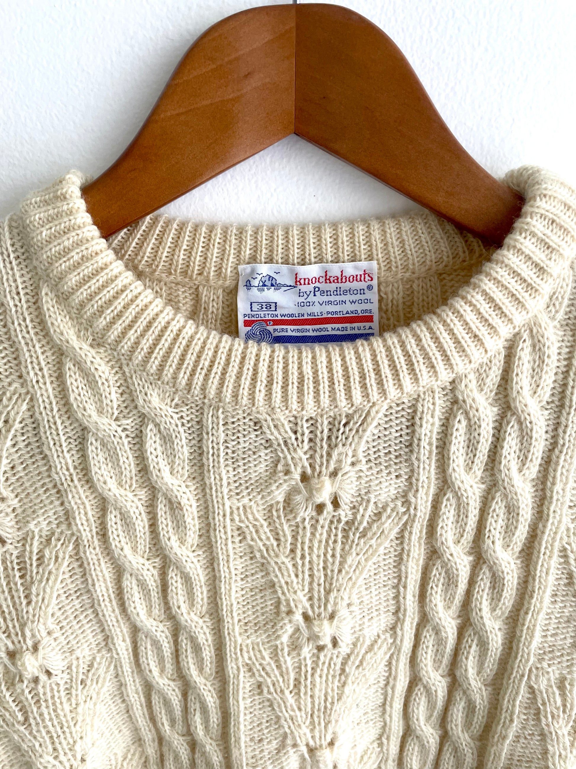 A pristine showcase of the quality & skill behind Pendleton's storied name, this ivory woolen masterpiece from their mid-century Knockabouts line combines two distinct cable patterns for a truly one-of-a-kind heirloom find.